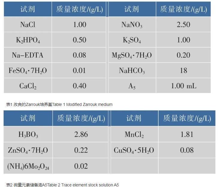 培養(yǎng)基:采用的改良的Zarrouk培養(yǎng)基配方,見(jiàn)表1、表2。