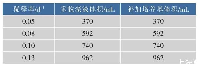 表3不同稀釋率下PBR中每天采收藻液和補(bǔ)加Zarrouk培養(yǎng)基的體積