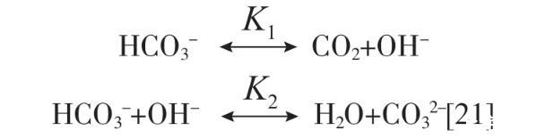 分析培養(yǎng)始末培養(yǎng)液的營養(yǎng)鹽濃度,結果見表5。經(jīng)過16 d的培養(yǎng),HCO3-和NO3--N濃度明顯減小,分別減少了83.13 mmol/L和124.34 mg/L,表明藻類利用HCO3-和NO3--N作為生長的碳源和氮源;CO32-濃度從初始30.60 mmol/L升高至77.75 mmol/L;培養(yǎng)過程中HCO3-濃度減少,CO32-濃度升高的原因是在水溶液中無機碳以CO2、HCO3-、CO32-這3種碳源形式存在,三者存在相互轉化的動態(tài)平衡: