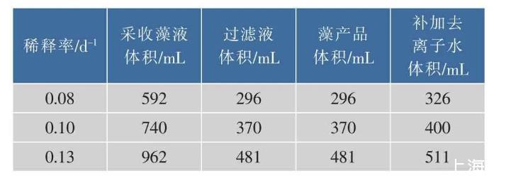 表4不同稀釋率下MPBR中每天采收藻液、獲得過濾液,藻產品體積和補加去離子水的體積
