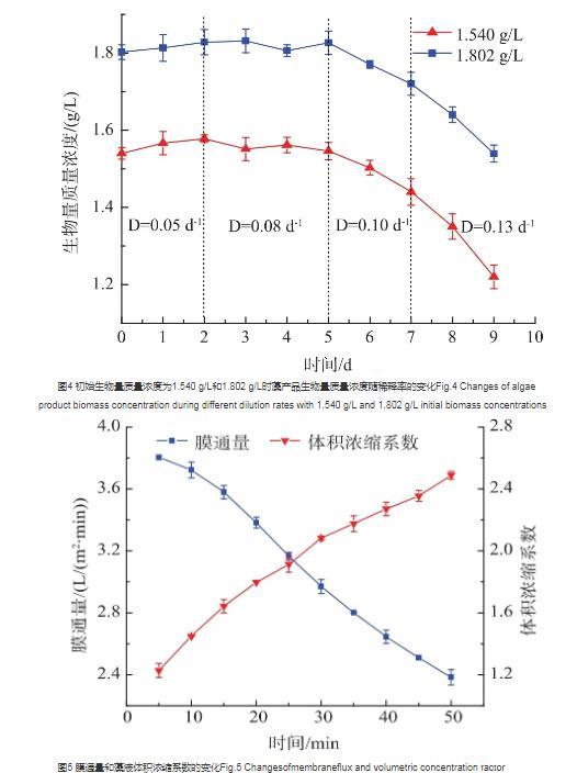 MPBR中利用膜組件對藻液進行過濾,濃縮時,增大藻液的體積濃縮系數(shù)可提高藻產品生物量濃度,但體積濃縮系數(shù)太高會加重膜污染,因此需選擇合適的體積濃縮系數(shù)。藻液質量濃度為1.855 g/L時,于過濾槽中進行實驗,結果見圖5。隨著體積濃縮系數(shù)的增大,藻液質量濃度變大,膜通量逐漸降低;第30分鐘時藻液體積濃縮系數(shù)達到2.082,此時膜通量由初始值3.803 L/(m2·min)下降至2.970 L/(m2·min),下降了21.92%。在膜組件使用過程中,為保持較高的膜通量水平,提高膜的使用壽命,防止膜污染加重對膜造成損壞以及增加運行成本,在一定壓力下,當膜通量下降20%左右時,需進行膜清洗。因此,利用PVDF膜組件過濾,濃縮生物量質量濃度約為1.8 g/L的藻液時,體積濃縮系數(shù)最大為2,可最大程度濃縮藻液。