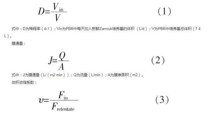稀釋率:每天加入至反應器中Zarrouk培養(yǎng)基的體積與反應器中培養(yǎng)基總體積之比即為稀釋率(dilution rate,D),計算公式: