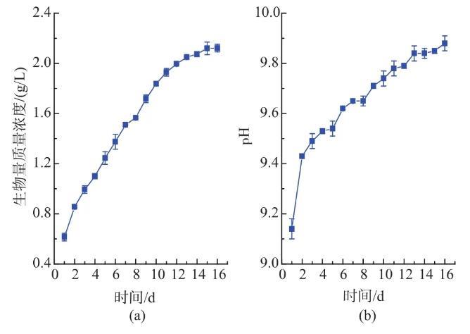 考察鈍頂螺旋藻在PBR中的生物量變化,結果見圖3(a)。隨著培養(yǎng)時間的進行,藻密度逐漸增大,第1~10天螺旋藻生長較快,生物量達到1.837 g/L;培養(yǎng)至第16天,生物量穩(wěn)定在2.122 g/L左右;從3(b)中可以看出,隨著螺旋藻的生長,pH值從初始9.14升高至9.88,在螺旋藻生長的適合范圍內。為維持PBR中適宜的藻濃度,保證較高生物量質量濃度下螺旋藻的快速生長,提高生物量產率,同時避免PBR中藻質量濃度太高而產生光遮蔽現(xiàn)象,根據(jù)生長曲線知,螺旋藻在第7~10天生長較快,生物量較高,所以選擇螺旋藻生物量質量濃度在1.5~1.8 g/L范圍內進行后續(xù)實驗。