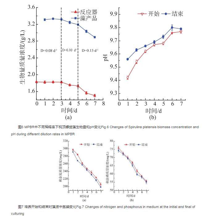 圖6 MPBR中不同稀釋率下鈍頂螺旋藻生物量和pH變化