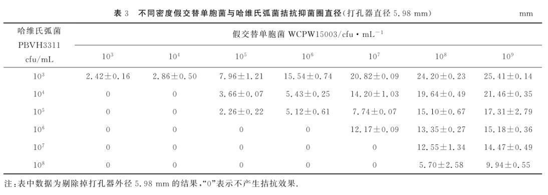 表3不同密度假交替單胞菌與哈維氏弧菌拮抗抑菌圈直徑(打孔器直徑5.98 mm)mm