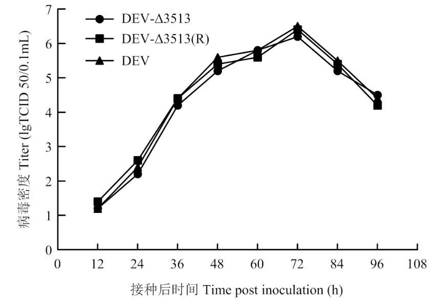 按照同樣的方法,去除RFP獲得了缺失UL56基因下游3 513 bp的重組病毒DEVΔ3513;用UL56基因下游3 513 bp替換病毒DEVΔ3513-RFP中的RFP,獲得了回復(fù)突變株DEVΔ3513(R)。經(jīng)測序鑒定,所構(gòu)建的3個重組病毒均正確。
