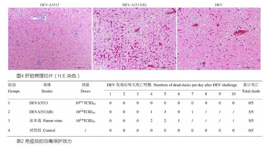 DEV親本毒、重組病毒DEV-Δ3513(R)在接種后3日麻鴨開始出現(xiàn)精神沉郁狀;7日全部死亡,剖檢肝臟表面有大量散在的白色壞死點。病理組織學(xué)觀察可見:靜脈和肝血竇淤血,充滿大量紅細胞;肝細胞內(nèi)有大量脂滴呈空泡狀,發(fā)生脂肪變性;部分區(qū)域出現(xiàn)局灶性肝細胞壞死,在壞死區(qū)域伴有炎性細胞,胞核溶解,與其他研究結(jié)果一致。而DEV-Δ3513接種鴨和對照鴨在14 d觀察期內(nèi),未出現(xiàn)任何臨床癥狀和死亡。病理組織學(xué)診斷可見肝臟組織結(jié)構(gòu)清晰,肝細胞形態(tài)正常,未見明顯病理變化。說明UL56基因下游3 513 bp缺失后毒力明顯減弱。
