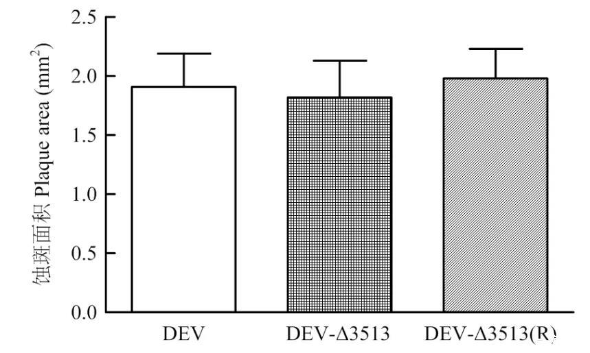 重組病毒及其親本毒均能在DEF細胞中形成清晰蝕斑;親本毒、DEV-Δ3513、DEV-Δ3513(R)蝕斑面積分別為(1.91±0.28)mm2、(1.82±0.31)mm2、(1.98±0.25)mm2,無顯著差異(>0.05)(圖5-9),說明UL56基因下游3 513 bp缺失不影響DEV在細胞間的傳播能力。