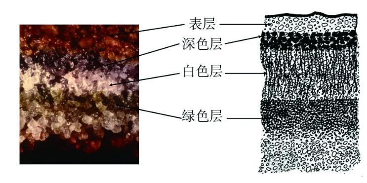 石隱生微生物在砂巖中形成典型的“地衣結(jié)構(gòu)”,即深(黑)色層為藻類細(xì)胞被顏色較深的真菌(地衣共生菌)菌絲包圍纏繞形成,白色層為松散的菌絲,綠色層主要為藻類細(xì)胞。