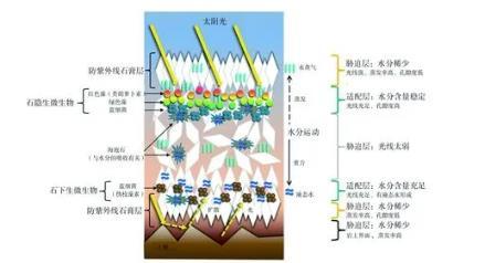 石生微生物生存的環(huán)境條件多種多樣,例如干旱、寒冷、高溫、鹽堿化、UV輻射、寡營養(yǎng)等。在長期的進(jìn)化過程中,石生微生物形成了耐受各種極端條件的機(jī)制。這些機(jī)制除了微生物自我調(diào)節(jié)外,最重要的是巖石本身對(duì)微生物適應(yīng)的幫助是巨大的。
