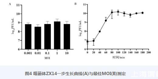 圖4噬菌體ZX14一步生長(zhǎng)曲線(A)與最佳MOI(B)測(cè)定