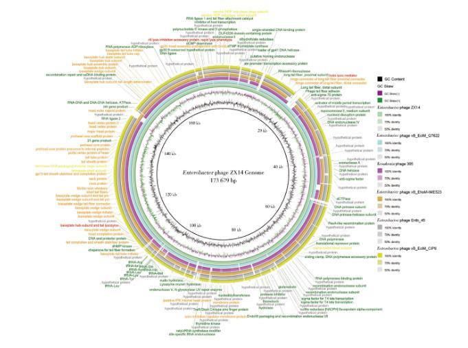 圖7噬菌體ZX14(綠色)與6種相似噬菌體基因組的可視化基因組圈圖