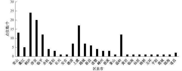 全省27個(gè)有甘藍(lán)鏈格孢菌分布的區(qū)縣市田間發(fā)生點(diǎn)位數(shù)統(tǒng)計(jì)如下(圖5)。具體為:常山13個(gè)、衢江5個(gè)、桐廬24個(gè)、淳安20個(gè)、臨平12個(gè)、余杭4個(gè)、富陽(yáng)3個(gè)、長(zhǎng)興1個(gè)、安吉1個(gè)、德清7個(gè)、上虞17個(gè)、越城7個(gè)、新昌6個(gè)、諸暨4個(gè)、嵊州3個(gè)、慈溪3個(gè)、象山1個(gè)、溫嶺12個(gè)、黃巖1個(gè)、臨海1個(gè)、仙居1個(gè)、路橋1個(gè)、玉環(huán)1個(gè)、平陽(yáng)1個(gè)、鹿城1個(gè)、甌海1個(gè)、遂昌2個(gè)。