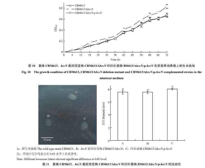 利用半固體SMM培養(yǎng)基,研究CBM613菌株、CBM613/ΔhrcN突變株和CBM613/ΔhrcN-p-hrcN回補菌株的運動性。通過測量菌落直徑,野生型菌株、突變株和回補菌株的運動能力沒有顯著差異,結(jié)果表明hrcN基因敲除沒有影響青枯雷爾氏菌的運動性(圖11)。