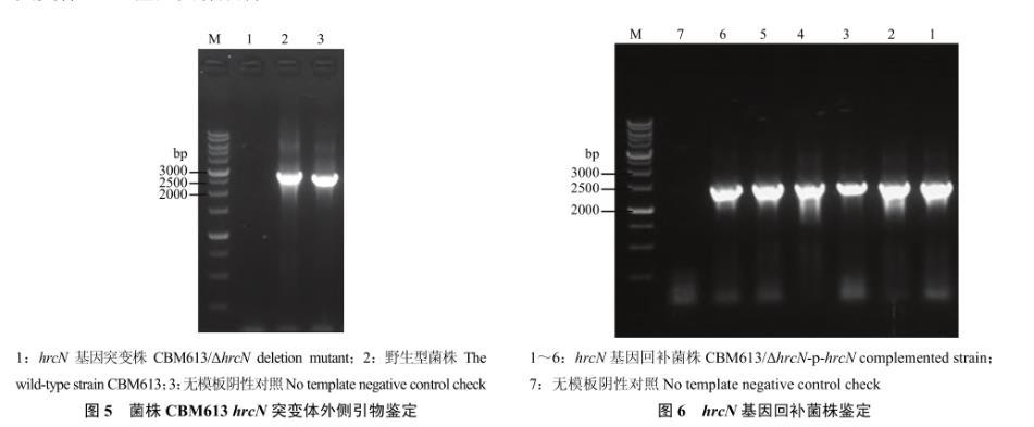 將上述1號克隆再次進(jìn)行hrcN基因內(nèi)部引物鑒定,為陰性擴增后用hrcN基因外側(cè)引物進(jìn)行進(jìn)一步的鑒定。圖5顯示,條帶2為原始菌株的擴增產(chǎn)物長度為2739 bp;條帶1為Gm抗性基因替換菌株的擴增產(chǎn)物長度為2580 bp,同時測序結(jié)果顯示局部序列同設(shè)計。該克隆子為最終的hrcN基因被Gm抗性基因替換的陽性克隆,稱為:CBM613/ΔhrcN。