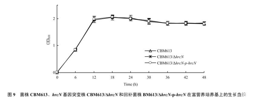 分別將CBM613菌株、CBM613/ΔhrcN突變株和CBM613/ΔhrcN-p-hrcN回補菌株在Boucher基礎(chǔ)液體培養(yǎng)基(貧營養(yǎng)培養(yǎng)基)和CPG培養(yǎng)基(富營養(yǎng)培養(yǎng)基)中進(jìn)行生長曲線測定,野生型菌株、突變株和回補菌株在富營養(yǎng)培養(yǎng)基上的生長速率差異不明顯(圖9)。