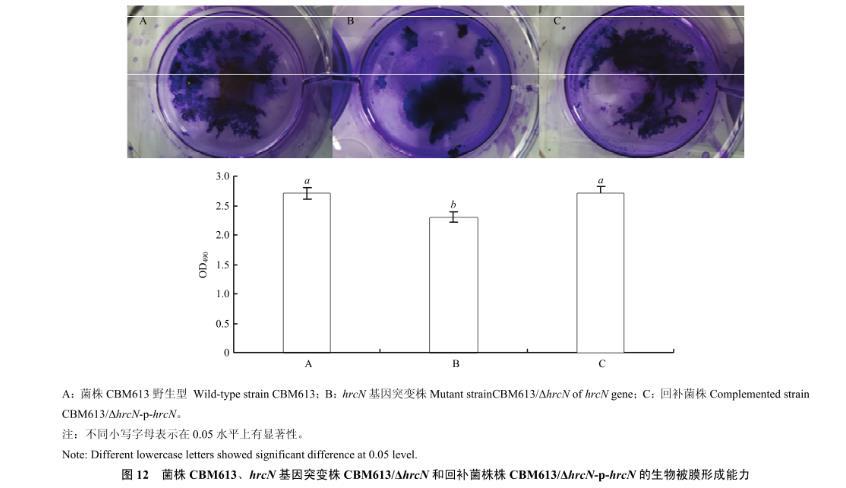 通過對比菌株CBM613、CBM613/ΔhrcN突變株和CBM613/ΔhrcN-p-hrcN回補菌株的生物被膜形成能力,結(jié)果發(fā)現(xiàn)3種青枯雷爾氏菌株的生物被膜形成能力隨培養(yǎng)時間增加而增強,突變株相比于野生型菌株,生物被膜形成能力顯著減弱,而回補菌株與野生型菌株相比差異不明顯(圖12)。