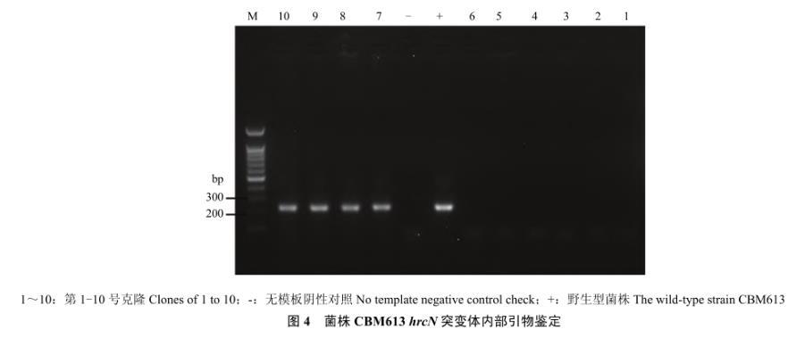 將供菌體和受菌體(CBM613菌株)混合結(jié)合后,抗性平板上培養(yǎng)單克隆,隨機挑選10個單克隆,用hrcN基因內(nèi)部引物進(jìn)行PCR鑒定。如發(fā)生二次重組,則這對引物無擴增產(chǎn)物,否則有227 bp的特異性擴增條帶。圖4結(jié)果顯示:第1~6號克隆為陰性擴增,表明hrcN基因可能已被敲除;7~10號克隆有227 bp的特異性條帶,說明沒有發(fā)生二次重組,hrcN基因未能成功敲除。