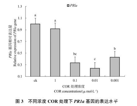 圖3不同濃度COR處理下PR1a基因的表達(dá)水平