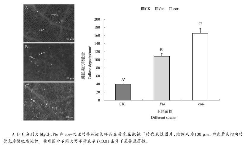 胼胝質(zhì)是植物抵御病原菌入侵的物理屏障。從圖6中可以看出,處理組誘導(dǎo)的胼胝質(zhì)沉積數(shù)量極顯著高于對照組,同時Pto處理組的胼胝質(zhì)沉積數(shù)量極顯著低于cor-處理組。熒光染色葉片觀測結(jié)果表明,接種細(xì)菌之后,番茄葉片啟動誘導(dǎo)胼胝質(zhì)沉積的基礎(chǔ)防御,而COR促進(jìn)細(xì)菌一定程度上抑制胼胝質(zhì)沉積,從而抑制植物防御。