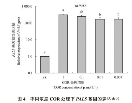 圖4不同濃度COR處理下PAL5基因的表達(dá)水平