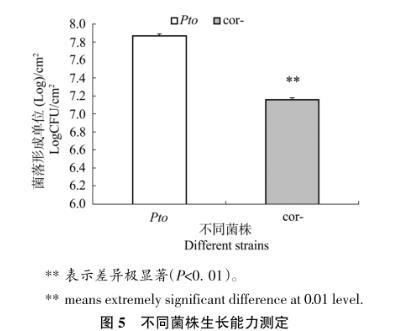 從圖5中可以看出,野生型菌株P(guān)to在番茄葉片中的生長能力極顯著高于COR缺失突變體cor-。同一接種濃度下接種不同菌株72 h后,葉片中Pto的種群密度為7.32×107CFU/cm2,cor-的種群密度為1.44×107CFU/cm2,Pto的種群密度約為cor-的5倍,表明病原菌不能分泌冠菌素后,病原菌的生長量明顯減少,說明COR能夠促進(jìn)病原菌在宿主植物中的生長。