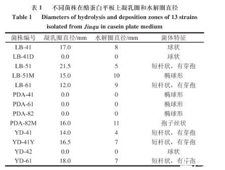 利用倍比稀釋法從發(fā)酵的江米酒中分離純化得到13株不同菌落形態(tài)的純種菌株,將分離純化得到的13株不同菌株分別以三點(diǎn)法點(diǎn)接于酪蛋白平板上,置于30℃恒溫培養(yǎng)箱內(nèi)培養(yǎng)2 d,觀察并測(cè)定菌株所產(chǎn)凝乳圈及水解圈直徑(表1)。