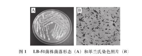 圖1 LB-51菌株菌落形態(tài)(A)和革蘭氏染色照片(B)