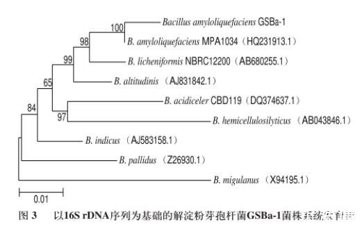 圖3以16S rDNA序列為基礎(chǔ)的解淀粉芽孢桿菌GSBa-1菌株系統(tǒng)發(fā)育樹