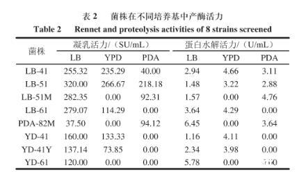 將有白色凝乳圈的8株菌分別接種于LB、yPD和PDA液體培養(yǎng)基中,在30℃、120 r/min條件下恒溫振蕩培養(yǎng)24 h,測(cè)定凝乳和蛋白水解活力,結(jié)果如表2所示。