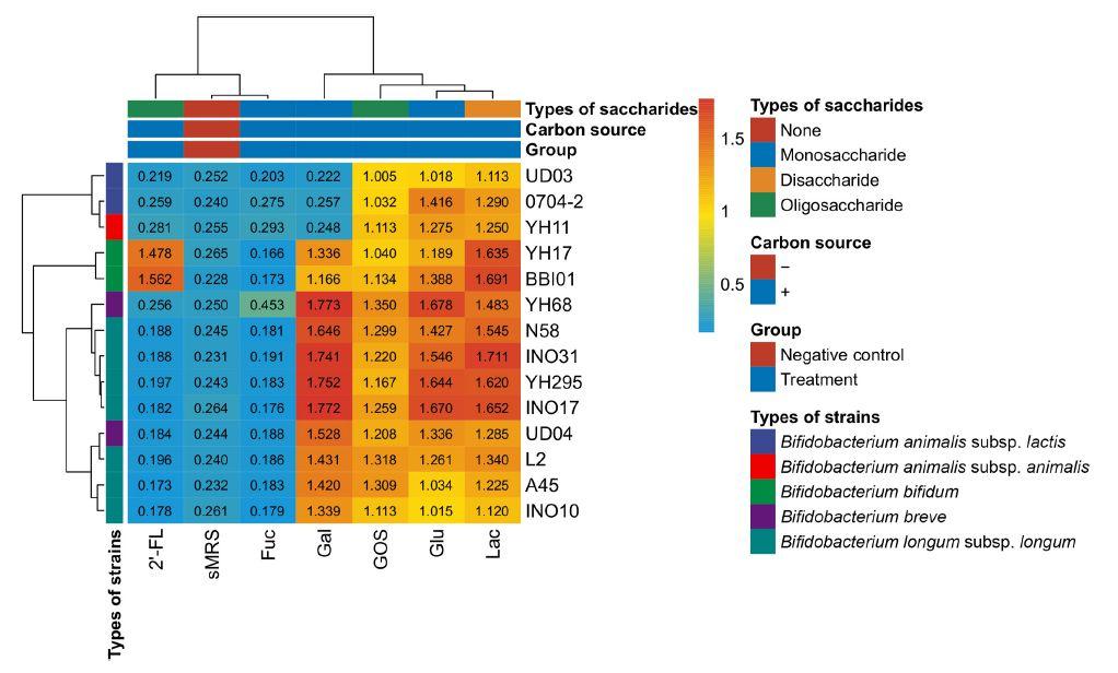 圖1、使用含或不含碳水化合物的培養(yǎng)基實現(xiàn)雙歧桿菌的最大生長。最大生長定義為雙歧桿菌在無碳水化合物的半定MRS(sMRS)或補(bǔ)充有1%(w/v)葡萄糖(Glu)、半乳糖(Gal)、巖藻糖(Fuc)、乳糖(Lac)、低聚半乳糖(GOS)或2'-巖藻糖基乳糖(2'-FL)的sMRS中在600 nm處達(dá)到的最大光密度(OD600)。在sMRS中未觀察到生長。減去不含細(xì)菌或碳水化合物的空白對照孔以校正OD600值。