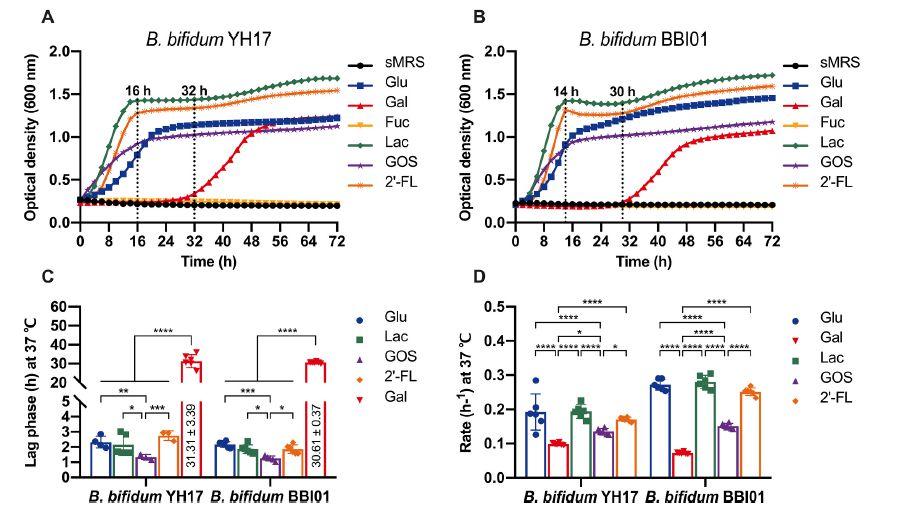 圖2、雙歧雙歧桿菌YH17和兩歧雙歧桿菌BBI01的生長。(A)雙歧雙歧桿菌YH17的生長曲線。(B)B.bifidum BBI01的生長曲線。(C)兩歧雙歧桿菌YH17和兩歧雙歧桿BBI01的滯后期。(D)雙歧雙歧桿菌YH17和雙歧雙歧桿菌BBI01的最大生長速率。雙歧雙歧桿菌菌株在無碳水化合物的半定MRS(sMRS)或補(bǔ)充有1%(w/v)葡萄糖(Glu)、半乳糖(Gal)、巖藻糖(Fuc)、乳糖(Lac)、低聚半乳糖(GOS)或2′-巖藻糖基乳糖(2′-FL)的sMRS中生長。