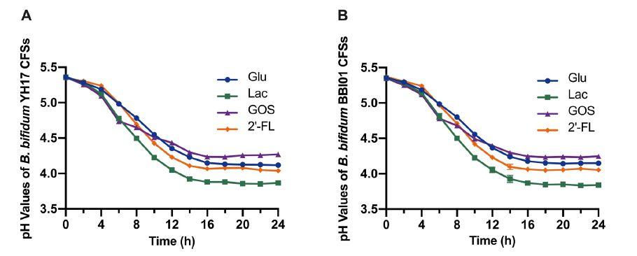 圖5、來自葡萄糖(Glu)、乳糖(Lac)、低聚半乳糖(GOS)或2′-巖藻糖基乳糖(2′-FL)作為唯一碳源的培養(yǎng)基的無細(xì)胞上清液(CFS)的pH值。
