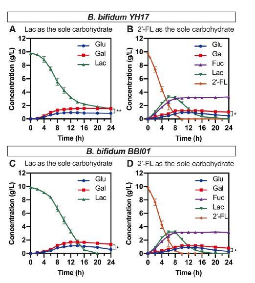 圖3、乳糖(Lac)或2'-巖藻糖基乳糖(2'-FL)的糖譜被兩歧雙歧桿菌YH17和兩歧雙歧桿菌BBI01降解。(A)(C)以Lac作為唯一碳源的培養(yǎng)基中葡萄糖(Glu)、半乳糖(Gal)和Lac濃度的變化。(B)(D)以2′-FL作為唯一碳源的培養(yǎng)基中Glu、Gal、巖藻糖(Fuc)、Lac和2′-FL濃度的變化。