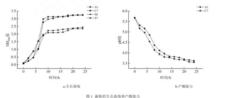 a-生長曲線;b-產(chǎn)酸能力圖1菌株的生長曲線和產(chǎn)酸能力