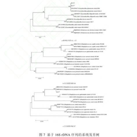 a-植物乳桿菌A1、C7;b-沃氏葡萄球菌S6;c-巴氏葡萄球菌S7圖7基于16S rDNA序列的系統(tǒng)發(fā)育樹