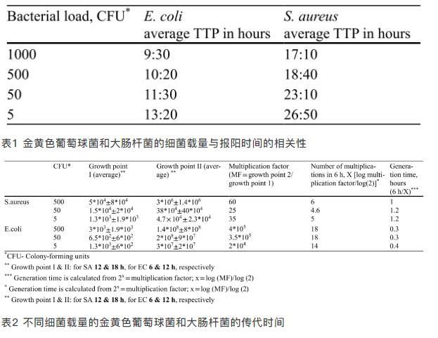 表1金黃色葡萄球菌和大腸桿菌的細菌載量與報陽時間的相關(guān)性表2不同細菌載量的金黃色葡萄球菌和大腸桿菌的傳代時間02