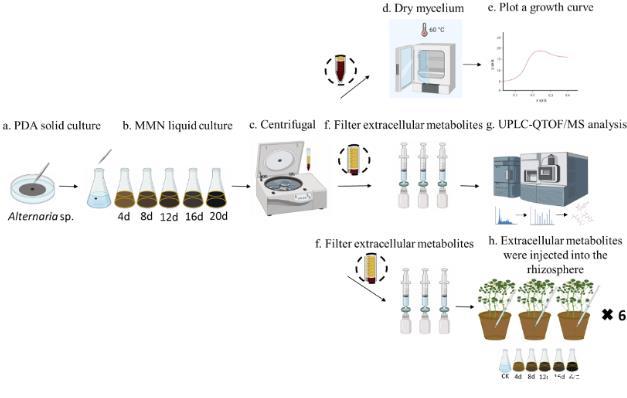 時間因素顯著影響DSE生長和胞外代謝物組分變化。不同生長時間的DSE胞外代謝物組分具有顯著差異。通過對DSE胞外代謝物組分進行LC-MS分析,共鑒定出137種化合物。以氨基酸,肽類化合物為主。在紫花苜蓿根際添加DSE胞外代謝物,可以促進紫花苜蓿生長和養(yǎng)分吸收。在盆栽條件下,添加培養(yǎng)8 d的DSE胞外代謝物對紫花苜蓿促生效果最明顯,顯著提高紫花苜蓿生物量、養(yǎng)分含量和養(yǎng)分利用率?;诜前邢虼x組學(xué)技術(shù)結(jié)合植物和土壤參數(shù)分析,推測DSE胞外代謝物主要通過直接被植物作為養(yǎng)分吸收,化學(xué)信號調(diào)節(jié)植物的養(yǎng)分吸收過程,刺激植物根系提高植物養(yǎng)分吸收能力,刺激植物根系分泌更多的酶活化土壤養(yǎng)分四種途徑對植物產(chǎn)生促生作用。本研究表明DSE胞外代謝物可以作為植物生物刺激劑,但接下來仍需要充分了解其所含的組分對植物產(chǎn)生的養(yǎng)分吸收的分子調(diào)控,并對其進行野外更貼合實際環(huán)境的復(fù)雜因素下的研究。