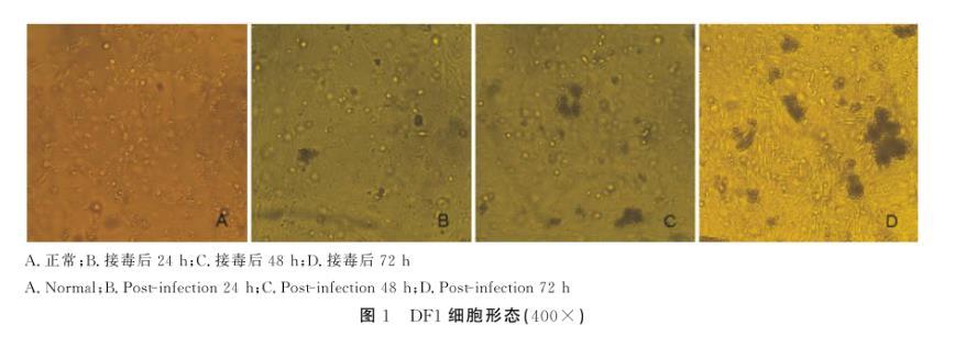 接毒12 h后即可觀察到CPE,在48 h時最明顯,主要細胞病變?yōu)榧毎s、破碎,脫落,成團,邊緣不清晰,個別胞體出現(xiàn)變大,死亡等特征,對照組細胞生長良好(圖1)。
