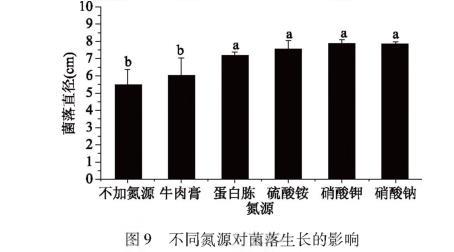 相同的培養(yǎng)時間,菌落直徑與不同氮源的關系如圖9所示。