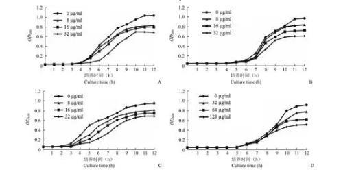 圖1小檗堿對(duì)腸道菌生長(zhǎng)曲線的影響(A:金黃色葡萄球菌;B:弗氏志賀菌;C:痢疾志賀菌;D:沙門(mén)菌)