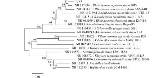將LJK8菌株的16S rDNA序列提交到GenBank數(shù)據(jù)庫并構(gòu)建菌株的系統(tǒng)發(fā)育樹,見圖5??梢猿醪借b定LJK8菌株屬于Rheinheimeraaquatica(水萊茵海默氏菌),擴(kuò)增的16S rDNA與Rheinheimeraaquatica序列相似性達(dá)到99.99%,序列同源性為98%,所以初步確定該菌株為Rheinheimeraaquatica。