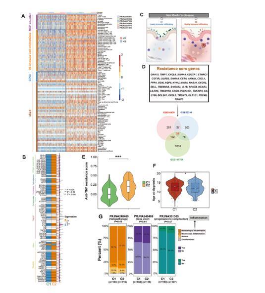 圖3克羅恩病免疫浸潤亞型鑒定及臨床關(guān)聯(lián),呈現(xiàn)免疫亞型分類、免疫細胞浸潤差異及抗TNF耐藥性/診斷年齡關(guān)聯(lián)
