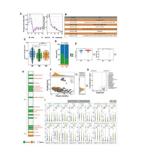 為揭示CD免疫微環(huán)境異質(zhì)性及微生物群對免疫狀態(tài)的影響,篩選與臨床表型相關(guān)的關(guān)鍵免疫亞型,研究基于MCPcounter算法評估免疫細胞浸潤,通過共識聚類劃分免疫亞型,并結(jié)合抗TNF耐藥基因集及微生物差異分析(MaAsLin2、LEfSe)。研究將CD樣本分為兩種免疫浸潤亞型(C1/C2)。C2亞型整體免疫細胞浸潤水平顯著高于C1(P<0.001),且富集抗原呈遞、促炎信號相關(guān)基因(如CXCL1、CCL2),提示過度免疫激活狀態(tài)。進一步結(jié)合抗TNF耐藥基因集分析,發(fā)現(xiàn)C2亞型耐藥基因表達顯著升高(P<0.01),且患者診斷年齡更早(P<0.05),提示更差的臨床表型。
