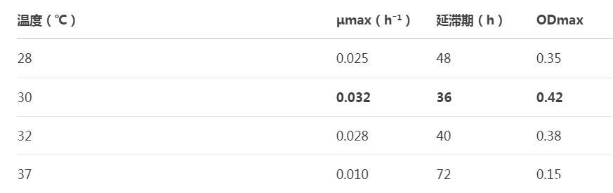 綜合指標(biāo):選擇μmax最高且ODmax穩(wěn)定的溫度區(qū)間。