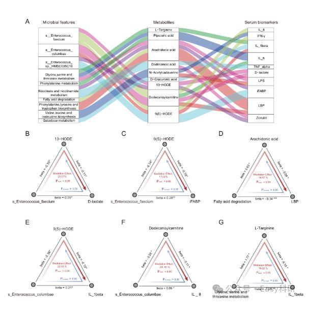 P mediation<0.05,P inverse mediation>>0.05,圖7A)。有趣的是,大多數(shù)聯(lián)系與Enterococcus faecium(四個聯(lián)系)、Enterococcus columbae(三個聯(lián)系)以及甘氨酸、絲氨酸和蘇氨酸代謝的微生物功能(三個聯(lián)系)有關(guān)。我們的中介分析表明,Enterococcus faecium可能通過降低糞便中13-HODE(26%,P mediation<0.05,圖7B)和α-二態(tài)膽酸(9(S)-HODE;17%,P mediation<0.05,圖7C)的水平來導(dǎo)致腸道屏障損害(以血清D-乳酸和iFABP水平升高為特征),這兩者都是LA衍生物?!?