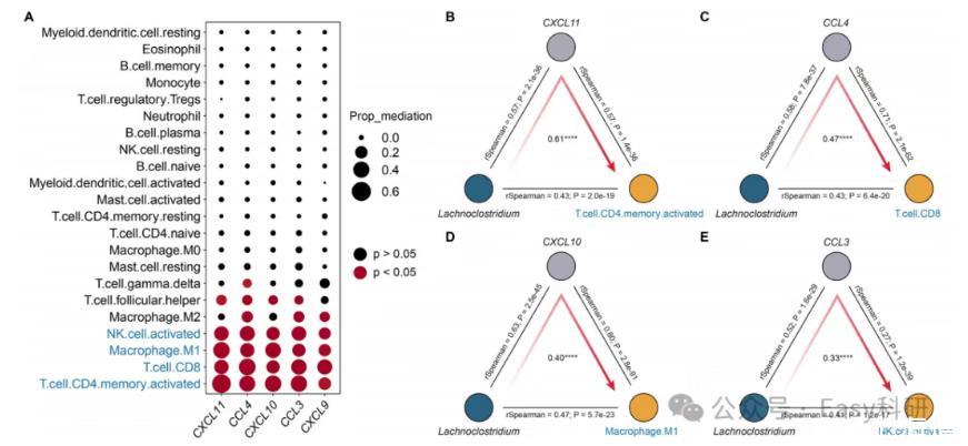 其中,作者對所有樣本進(jìn)行了因果中介分析,以調(diào)查Lachnoclostridium(梭狀芽孢桿菌),趨化因子和免疫細(xì)胞之間的聯(lián)系。對于同時和梭狀芽孢桿菌顯著相關(guān)的趨化因子和免疫細(xì)胞,作者應(yīng)用中介分析來評估梭狀芽孢桿菌對免疫細(xì)胞豐度的影響是否通過趨化因子介導(dǎo)。