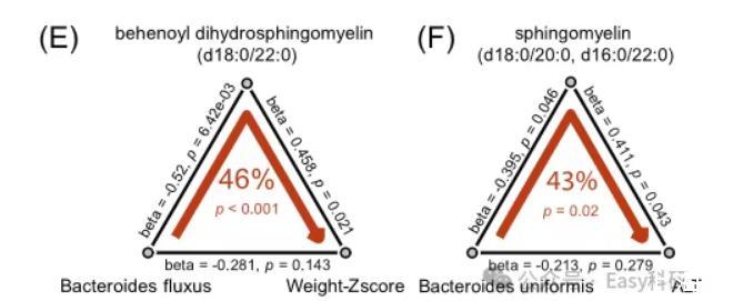 “隨后,中介分析表明,Bacteroides fluxus可能通過影響血清中behenoyl dihydrosphingomyelin(d18:0/22:0)的水平來促進(jìn)體重減輕(46%,p<0.001);Bacteroides uniformis可能通過降低sphingomyelin水平(d18:0/20:0,d16:0/22:0)(43%,p=0.02),起到減輕肝損傷的保護(hù)作用(圖4E,F(xiàn))。這些結(jié)果有力地支持?jǐn)M桿菌通過調(diào)節(jié)宿主微生物群鞘脂代謝的穩(wěn)態(tài)對MASLD的保護(hù)作用?!?