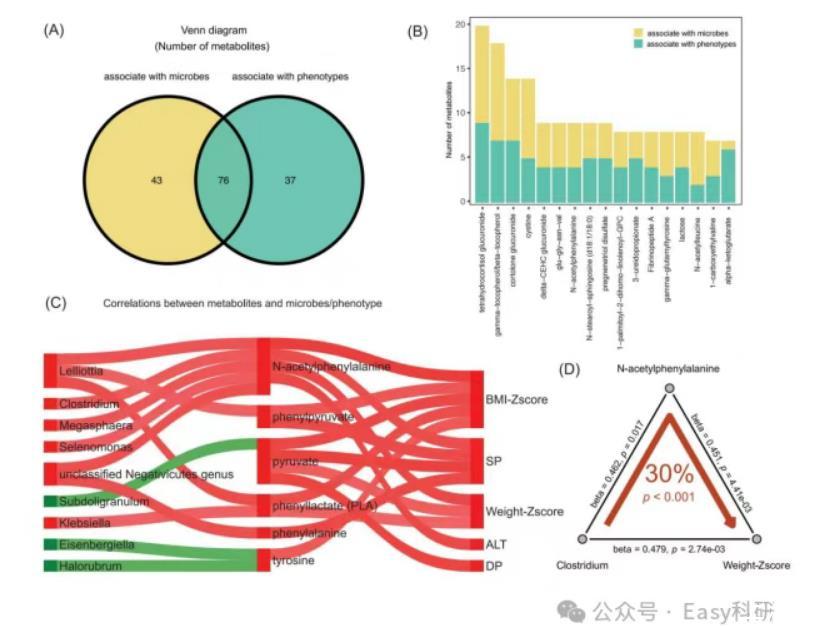 “在MetOrigin 2.0中,使用中介分析來揭示腸道菌群改變與疾病發(fā)生之間的復(fù)雜聯(lián)系,代謝產(chǎn)物作為中介物。這種分析增強(qiáng)了我們對微生物群對宿主致病因素反應(yīng)的適應(yīng)性和反饋機(jī)制的理解。中介分析模塊從對微生物組、代謝組數(shù)據(jù)和表型參數(shù)的Spearman相關(guān)性分析開始(圖3A,B)。在Sankey網(wǎng)絡(luò)中鑒定和可視化與微生物組和表型參數(shù)相關(guān)的代謝物(圖3C)。在Sankey網(wǎng)絡(luò)的指導(dǎo)下,用戶隨后可以通過中介分析選擇感興趣的特定代謝物進(jìn)行進(jìn)一步驗(yàn)證,揭示關(guān)于腸道微生物組在人類健康或疾病發(fā)病中作用的功能見解和潛在因果關(guān)系(圖3D)。”