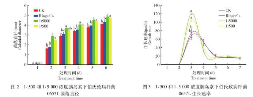 根據(jù)伯氏致病桿菌0657L的生長(zhǎng)速率繪制曲線圖(圖3),伯氏致病桿菌0657L的生長(zhǎng)速率在整個(gè)實(shí)驗(yàn)周期內(nèi)呈現(xiàn)由快至慢的趨勢(shì),符合邏輯斯蒂生長(zhǎng)曲線。1~2 d時(shí),由于菌落生長(zhǎng)緩慢,顯微鏡下觀察不到明顯菌落,即為延緩期;2~3 d時(shí),菌落快速生長(zhǎng),即為對(duì)數(shù)生長(zhǎng)期,共生細(xì)菌生長(zhǎng)速度最快;1∶500和1∶5 000胰島素處理組共生細(xì)菌生長(zhǎng)速率較空白對(duì)照組(CK)和林格氏液組顯著(P<0.05)加快,分別由空白對(duì)照組的68.0μm/d提高至104.7和120.4μm/d。1∶500胰島素處理組較空白對(duì)照組和林格氏液組分別加快36.7和30.6μm/d,1∶5 000濃度下,較空白對(duì)照組和林格氏液組分別加快52.5和46.4μm/d,但高濃度(1∶500)處理組與低濃度(1∶5 000)處理組之間無(wú)顯著差異(P>0.05)。3~7 d時(shí),菌落的生長(zhǎng)速率明顯變慢,后逐漸趨于平穩(wěn),即為穩(wěn)定期。